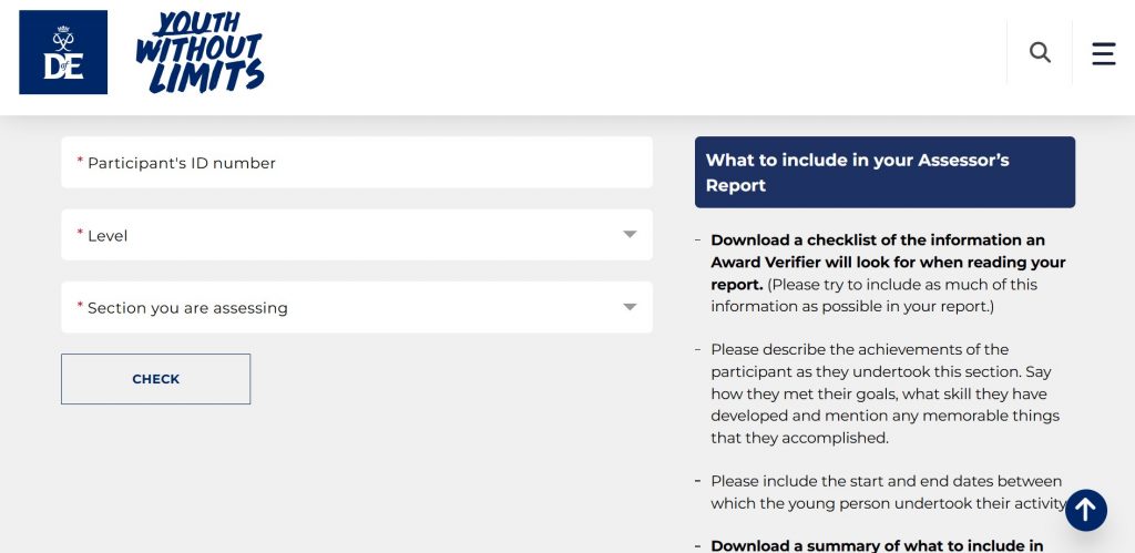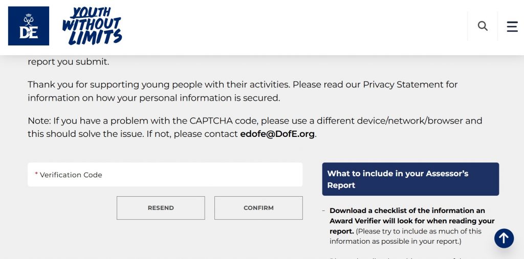 Once they have entered the Verification code, they will get the next screen where they input the Dofe Id, Section and Level.